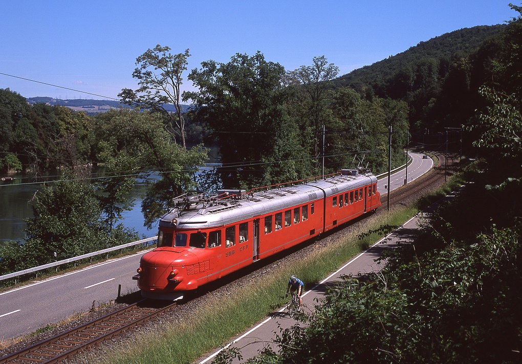 Triebwagentreffen Koblenz, August 2017. Bei Etzgen unmittelbar am Rhein entlang fährt ABe 4/4 11, einst aus den Beständen der SOB, heute beim Verein Tunnelkino zumeist Weissensteintunnel bei Solothurn unterwegs. Olli