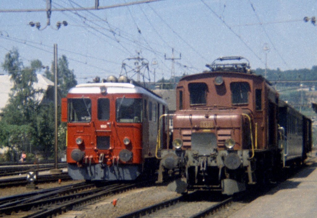 Zugkreuzung ca 1975 in Wildegg: Be 6/8 mit Schwerölzug zur Zementfabrik, auf Gleis 2 Durchfahrt eines Schnellzugs Zürich-Baden-Brugg-Aarau-Olten-Bern. (Scan ab Negativ) Georges Bossert