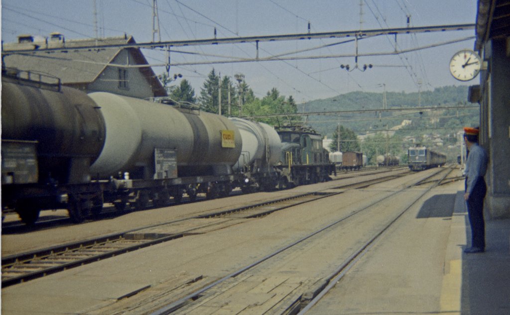 Wildegg Bahnhof, ankommende Ae 3/6 II mit Tankzug für die Zementfabrik Holderbank bei einem Betriebshalt etwa 1970. Die Wiederanfahrt in die Rangiergruppe (rückwärts in die Steigung Richtung Rupperswil) war für die Ae 3/6 II mit dem schweren Zug nicht möglich.