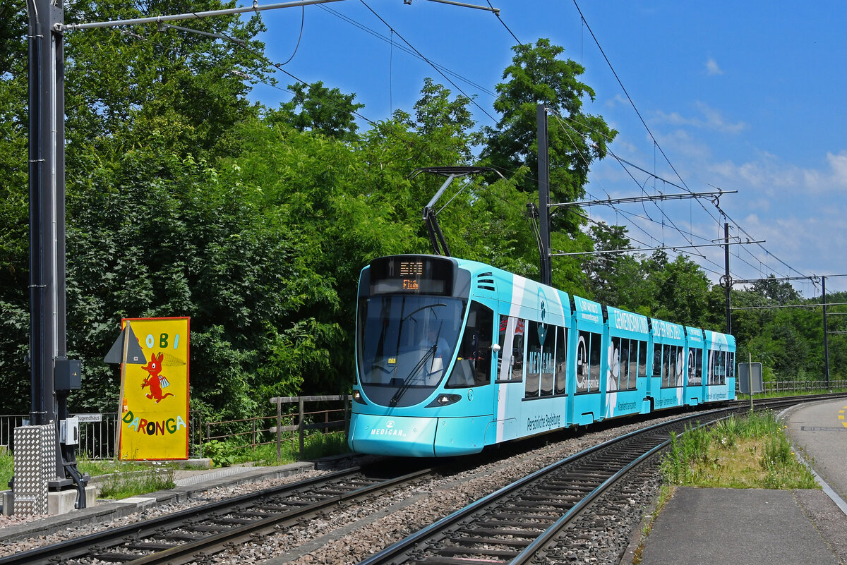 Be 6/10 Tango 164 mit der Medicar AG Werbung für Personen und Patienten Transport, auf der Linie 10, fährt am 24.06.2024 bei der Haltestelle Binningen Oberdorf ein. Aufnahme Binningen.