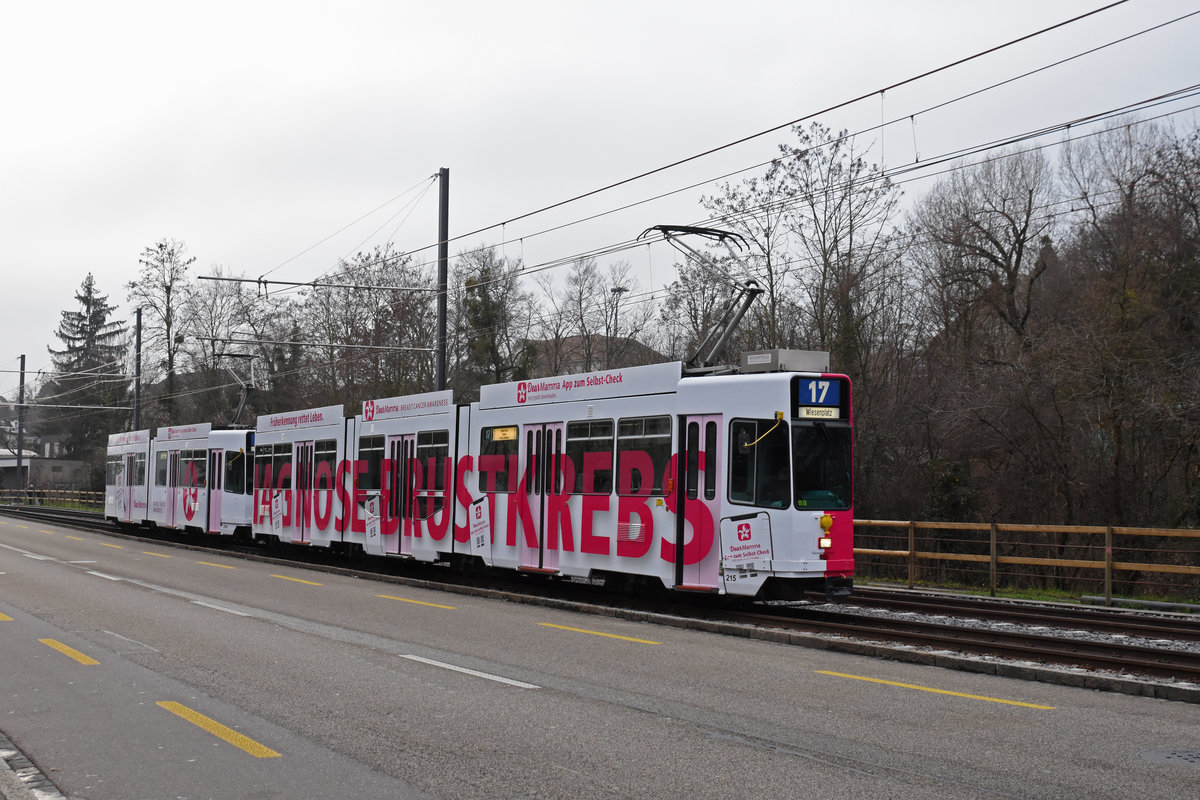 Doppeltraktion, mit dem Be 4/8 215 und dem Be 4/6 258 mit einer Werbung für Brustkrebs Vorbeugung, auf der Linie 17, fährt zur Haltestelle ZOO Basel. Die Aufnahme stammt vom 28.12.2019.