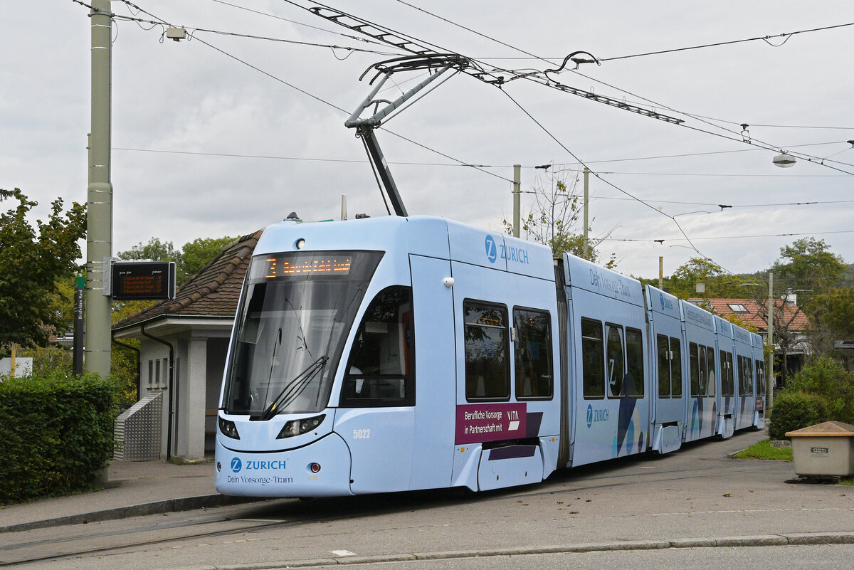 Be 6/8 Flexity 5022 mit der Werbung für die Zürich Versicherung, auf der Linie 3, wartet am 06.10.2025 bei der Endstation in Birsfelden. Markus Wagner