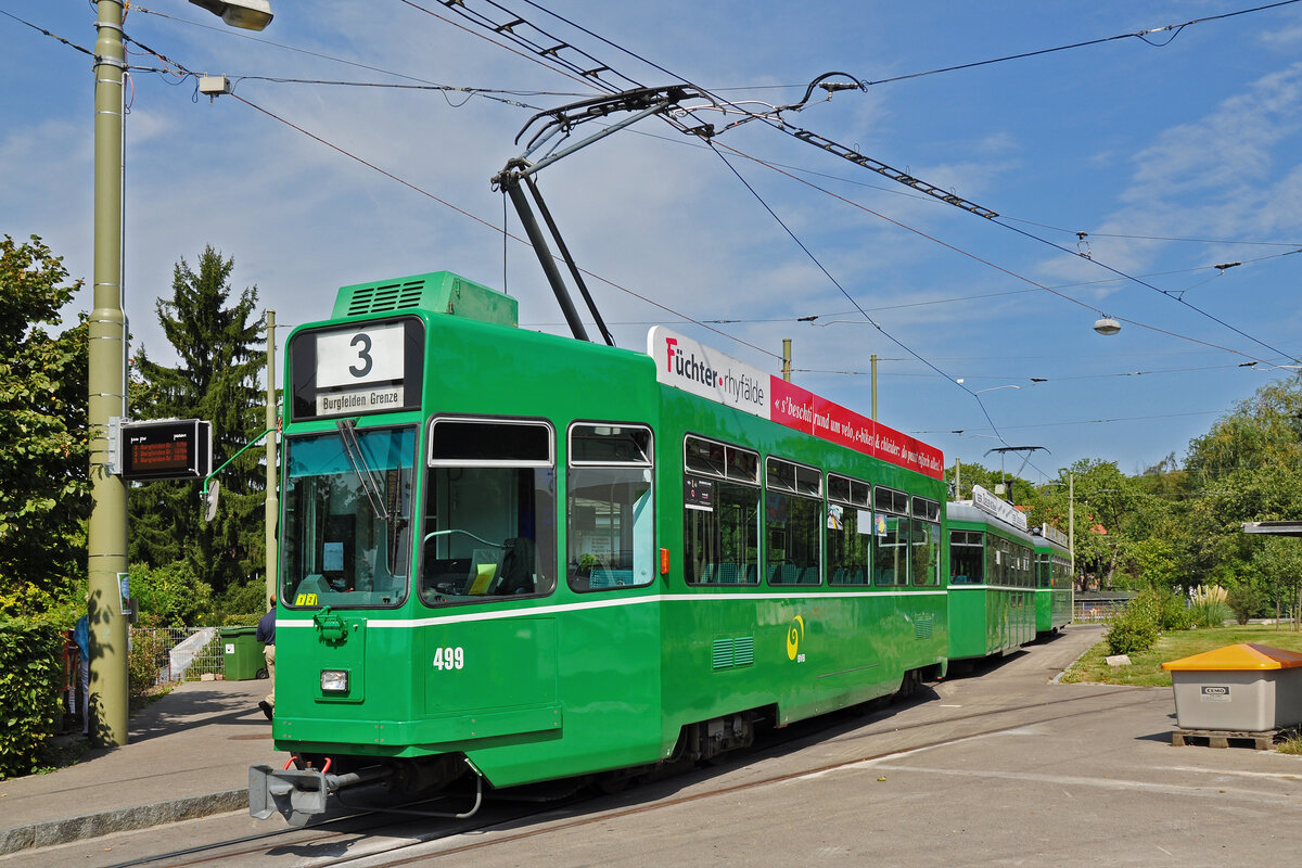 Doppeltraktion, mit dem Be 4/4 499, dem B4S 1493 und dem Be 4/4 467, auf der Linie 3, wartet am 25.08.2011 an der Endstation in Birsfelden. Markus Wagner