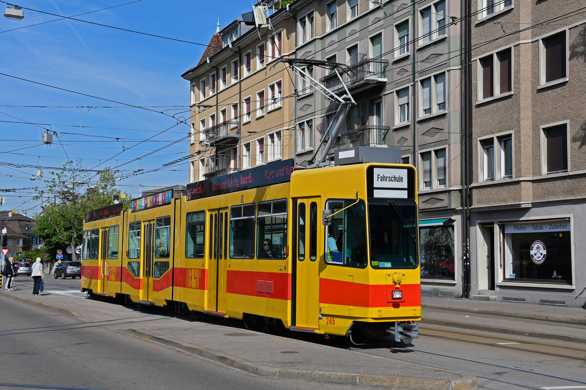 Doppeltraktion, mit dem Be 4/4 498, dem B4S 1505 und dem Be 4/4 489, auf der Linie 6, bedient die Haltestelle Morgartenring. Die Aufnahme stammt vom 20.08.2021. Markus Wagner