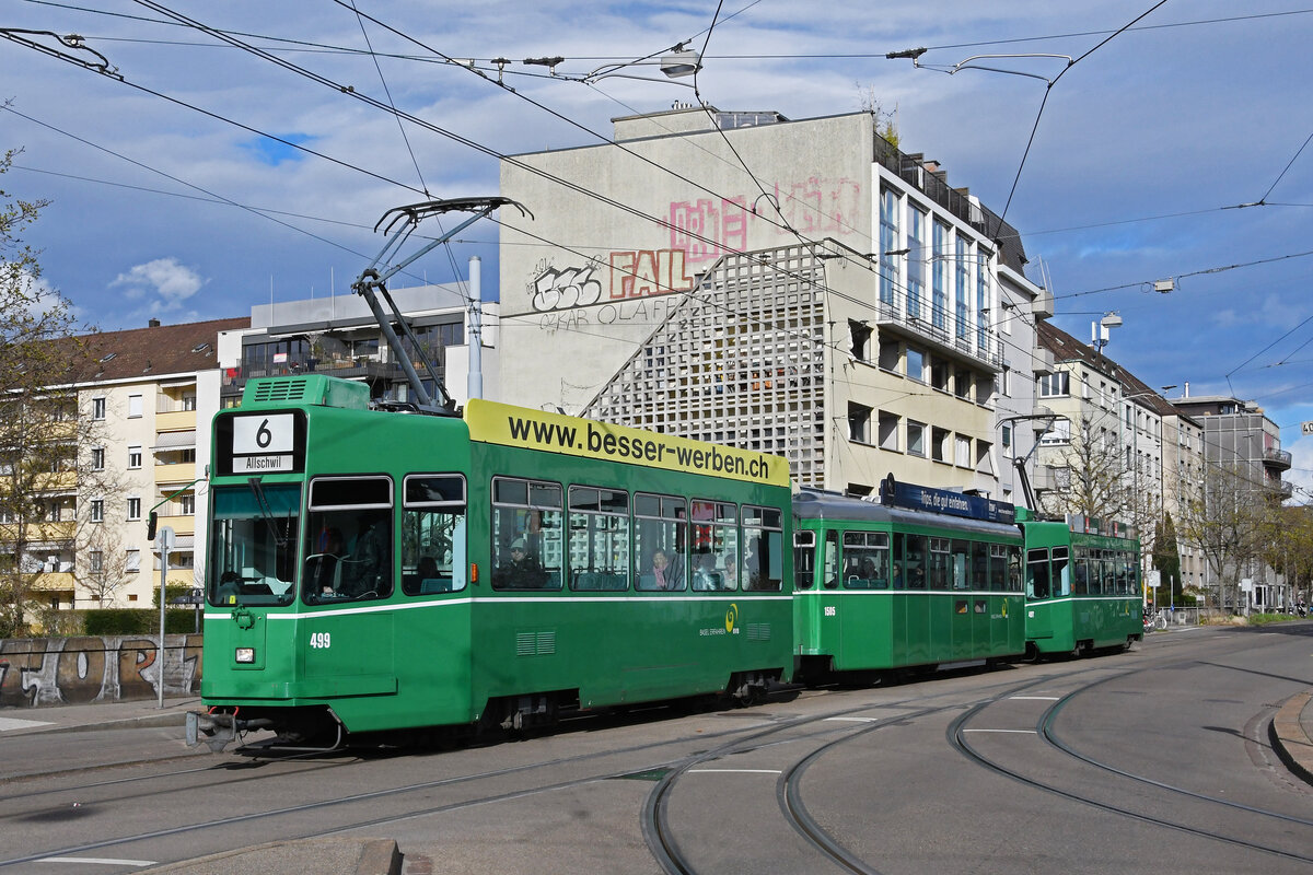 Doppeltraktion mit dem Be 4/4 499, dem B4S 1505 und dem Be 4/4 497, auf der Linie 6, fährt am 25.03.2023 bei der Haltestelle Morgartenring ein. Markus Wagner
