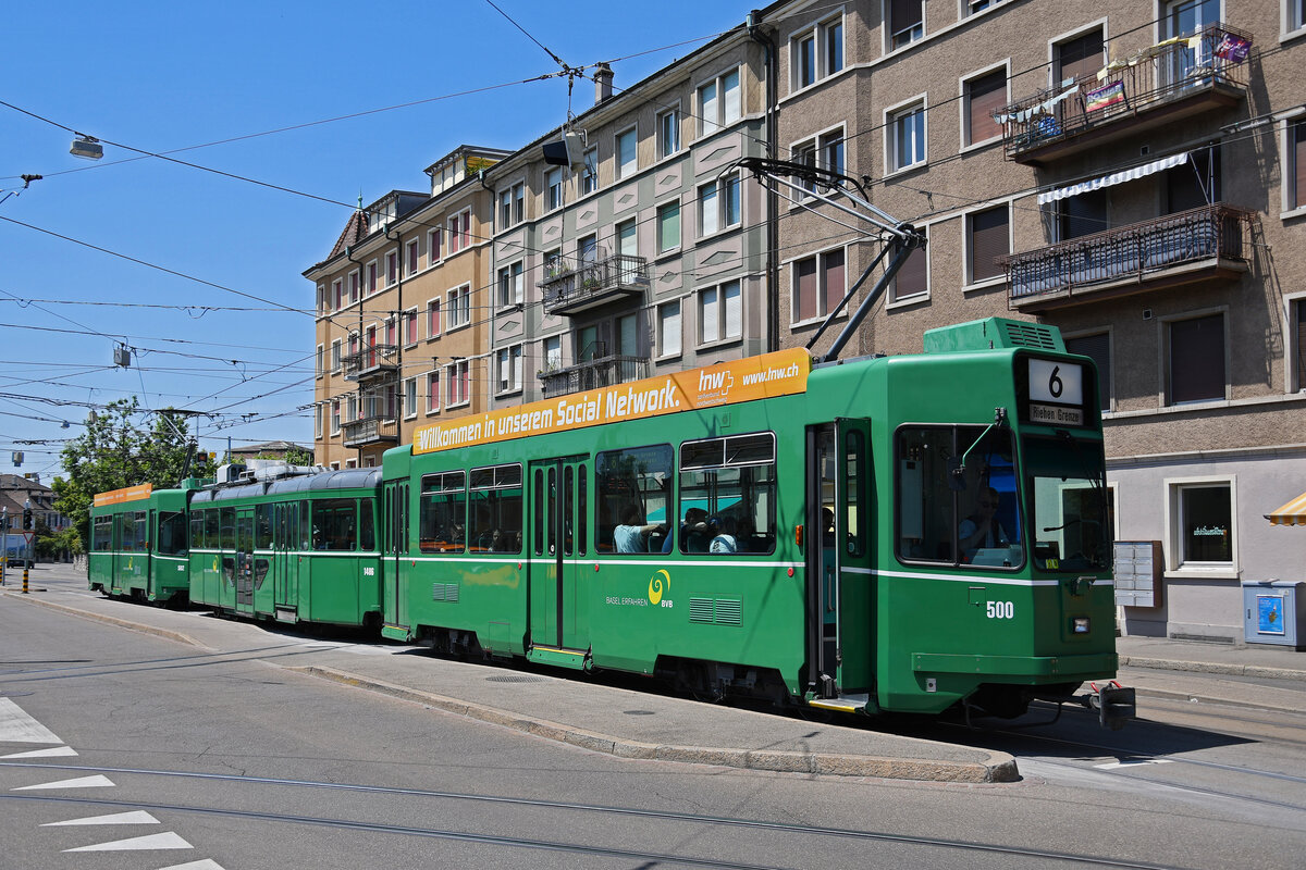 Doppeltraktion, mit dem Be 4/4 500, dem B4S 1486 und dem Be 4/4 502, auf der Linie 6, bedient am 14.06.2023 die Haltestelle Morgartenring. Markus Wagner