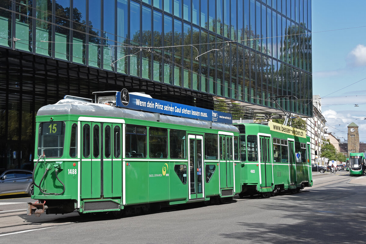 Be 4/4 483 zusammen mit dem B4S 1488, auf der wegen einer Baustelle in der Clarastrasse umgeleiteten Linie 15, fährt am 02.09.2025 zur Haltestelle Gewerbeschule. Aufnahme Basel.