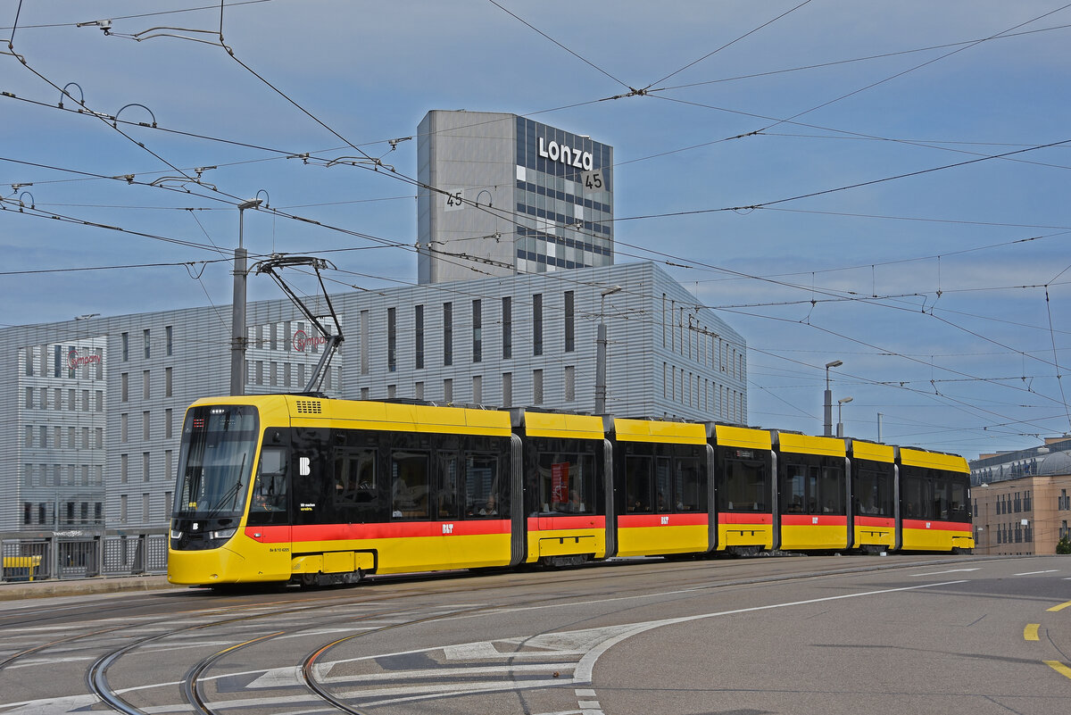 Be 6/8 Flexity 5002, auf der wegen einer Grossbaustelle umgeleiteten Linie 14, überquert am 11.08.2025 die Münchensteinerbrücke. Aufnahme Basel. Markus Wagner