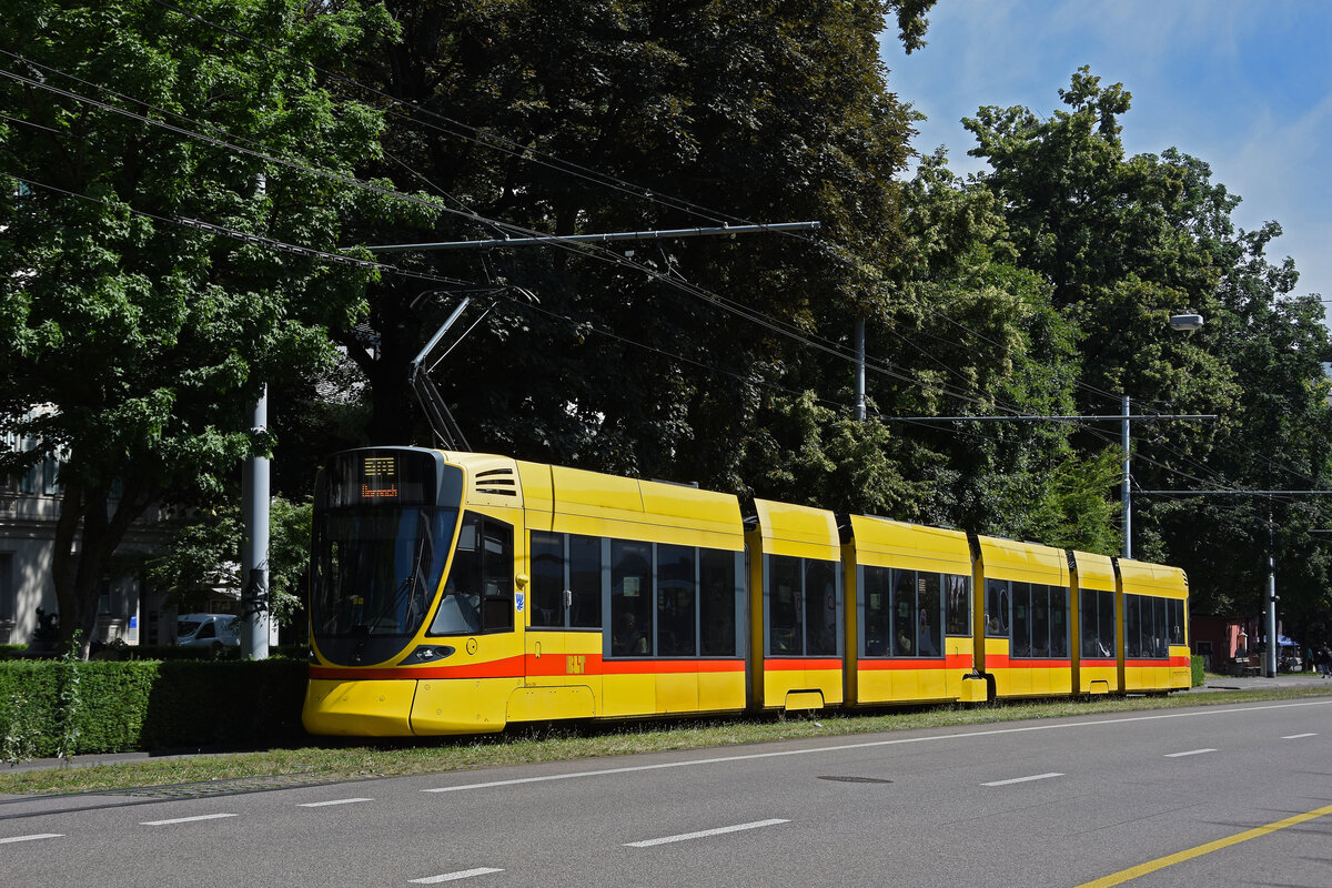 ... begegnen sich Flexity 2 6012 zur Schiffslände und ein Tango-Tram nach Aesch.