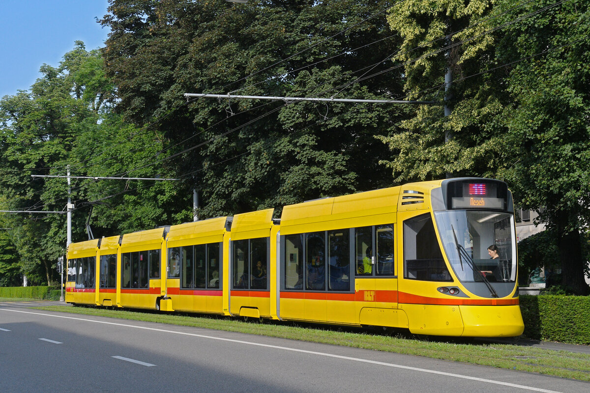 Oben angekommen an der Kreuzung Bankverein ist ein Stadler Tina Tram der Linie 11 nach Aesch.