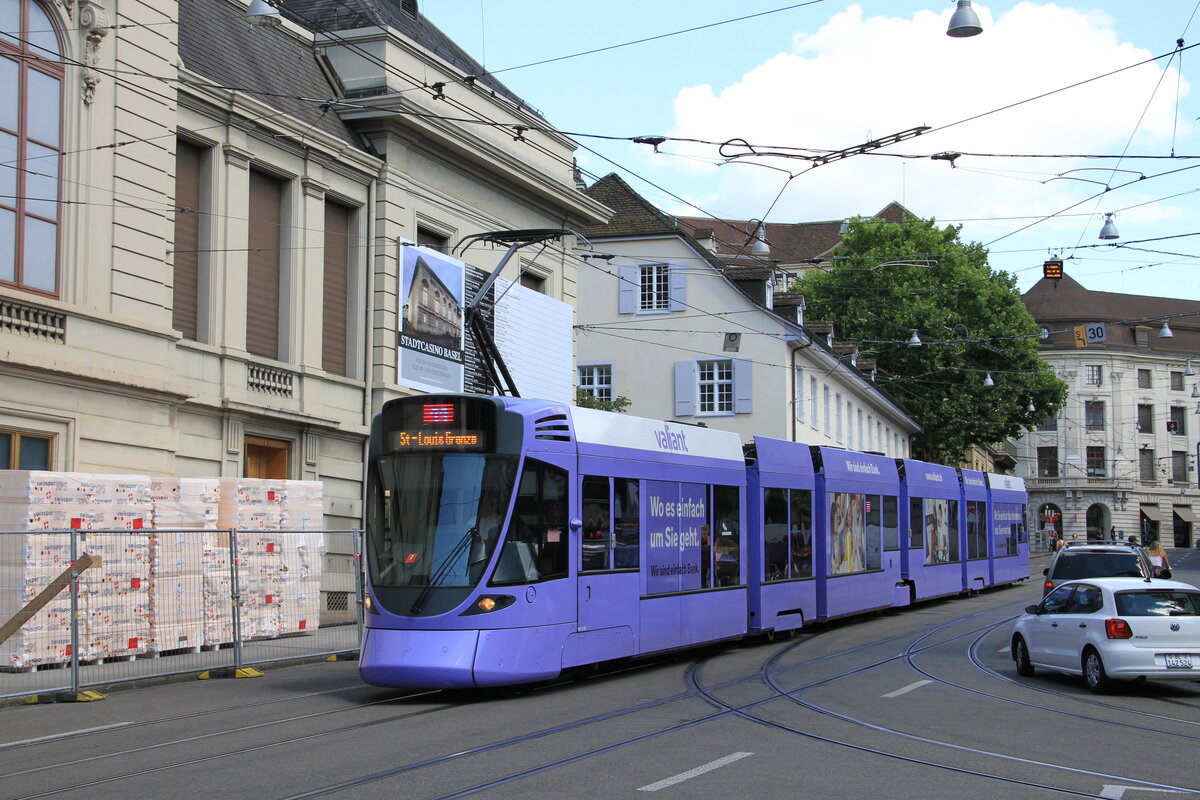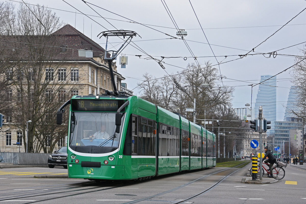 ... präsentiert sich Combino 306 im Licht der Morgensonne an der Kreuzung Bankverein in Basel.
