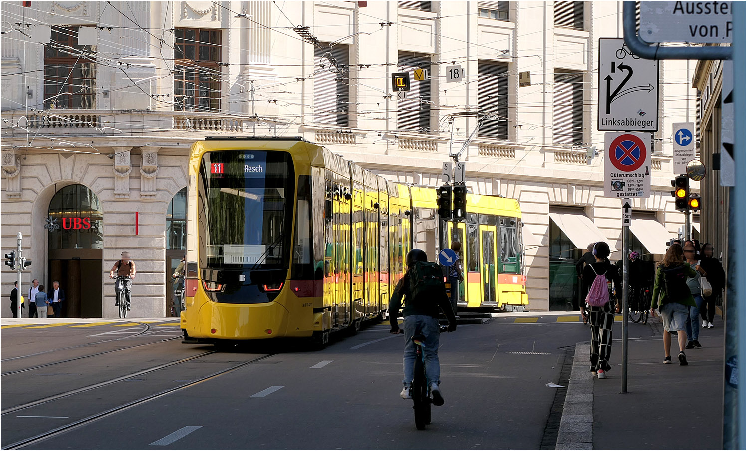 ... bildet das gelbe Stadler Tango-Tram der BLT vor den im Schatten liegenden Gebäuden an der Kreuzung bei der Haltestelle Bankverein.