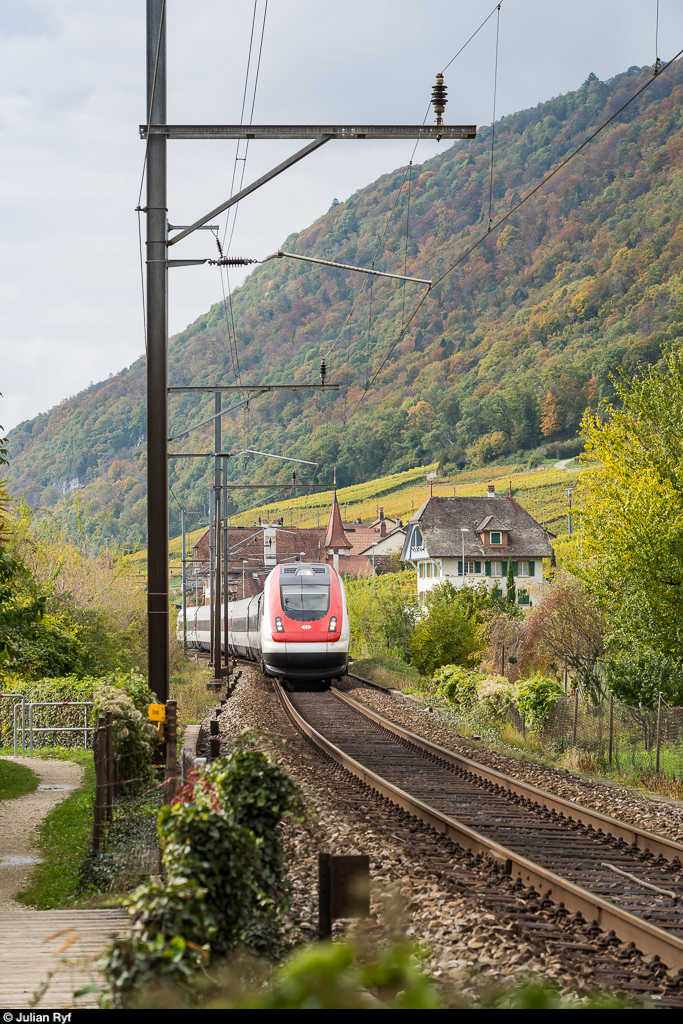 Am trüben Vormittag des 08.10.2025 fahren die Beacon Rail-193 711 und eine 193 der BLS zwischen Ligerz und La Neuveville in südlicher Richtung Horst Lüdicke