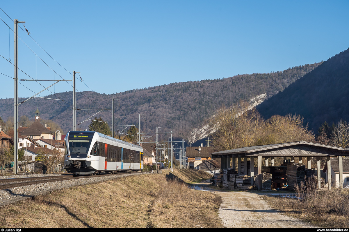 SBB RABe 526 264 am 17. Februar 2019 als RE Biel - La Chaux-de-Fonds bei der Durchfahrt in La Heutte. Die GTW AJU werden derzeit in Bellinzona revidiert und danach an Thurbo abgegeben. RABe 526 264 ist das erste solche Fahrzeug im Thurbo-Anstrich.
