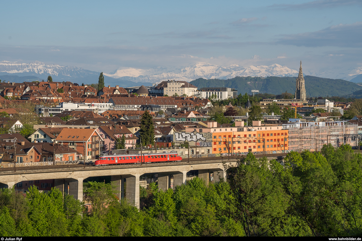 SBB RAe 4/8 1021 "Churchill-Pfeil" am 14. Mai 2019 auf dem Lorraineviadukt in Bern. Im Hintergrund das Berner Münster und die Berner Oberländer Alpen. Julian Ryf
