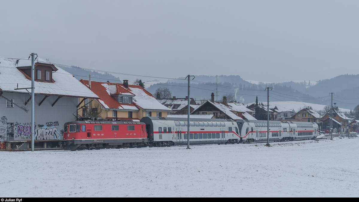 Der von der Re 4/4 II 11121 gezogene Zug konnte am 7. Februar auf Talfahrt in Gasel abgelichtet werden. Julian Ryf