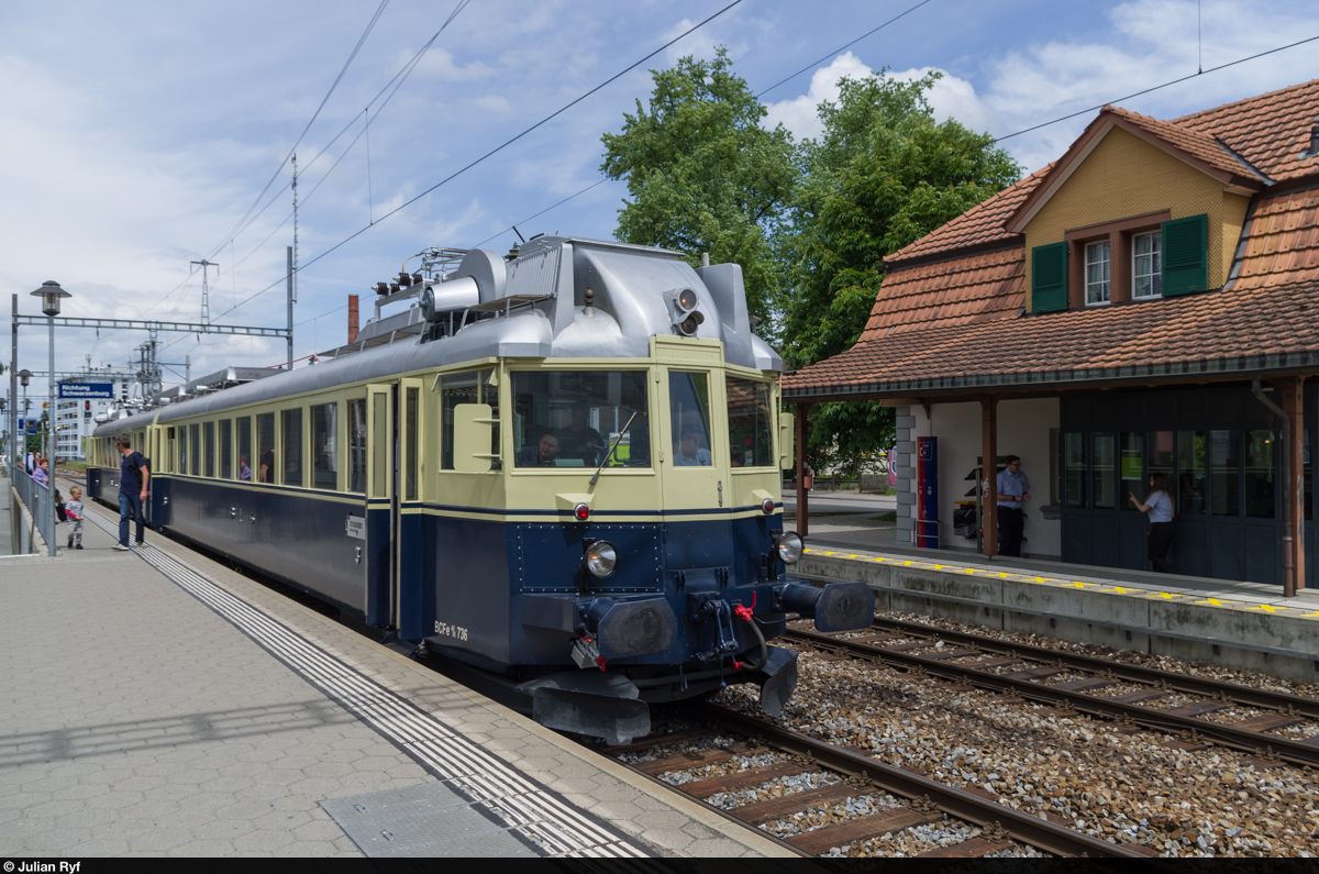 Aus Anlass der Taufe zweier MUTZ-Doppelstockzüge auf die Namen "Köniz" und "Schwarzenburg" wurden am 30. Mai 2015 auf der Strecke Bern-Schwarzenburg, welche als S6 in die S-Bahn Bern eingebunden ist, Fahrten mit dem historischen BCFe 4/6 736 angeboten. Hier bei einem Zwischenhalt in Köniz. Auch das Schalterpersonal der BLS sieht sich den Zug an. Julian Ryf
