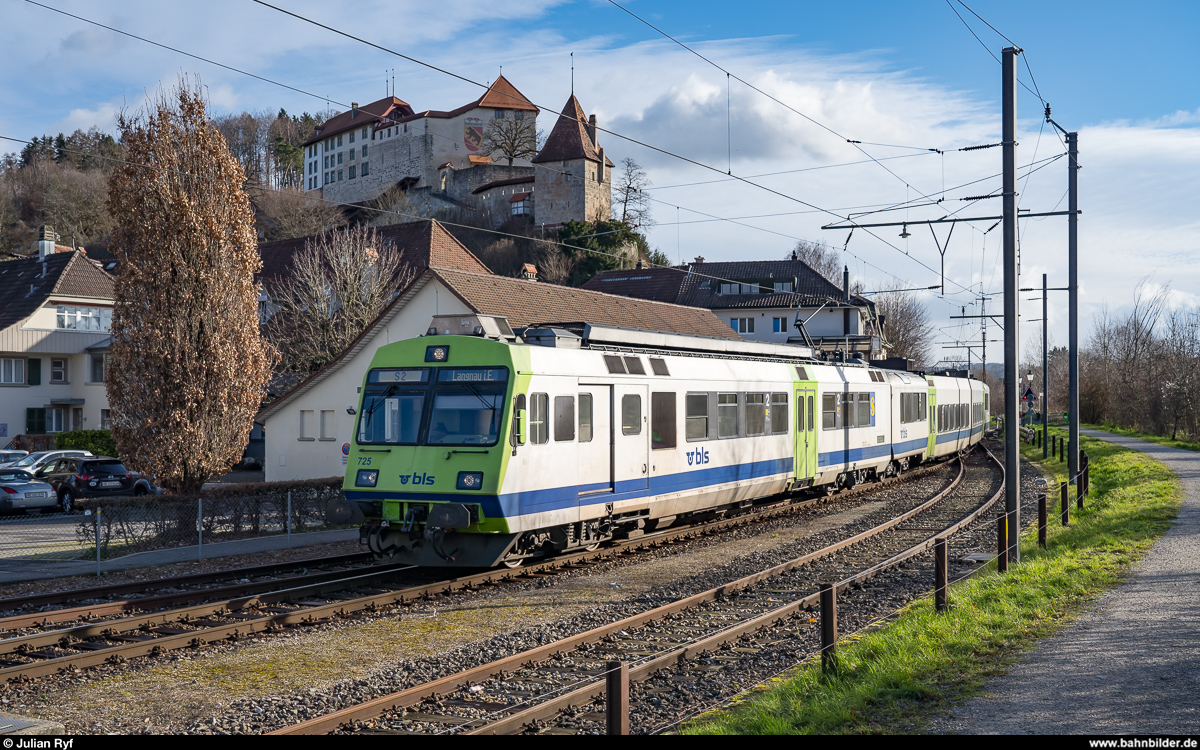 BLS RBDe 565 732 verlässt am 14. Dezember 2019 als S2 den Bahnhof Laupen. Die RBDe-Pendel werden aufgrund der Aufgabe der Werkstätte Aebimatt und der Verschiebung des Unterhalts in die Werkstätte Spiez zurzeit abgedreht. So war in den letzten Betriebstagen das bekannte Motiv mit dem Schloss Laupen auch noch mit führendem Triebwagen umsetzbar. An genau dieser Stelle wird in Zukunft der neue Bahnhof Laupen liegen. Julian Ryf