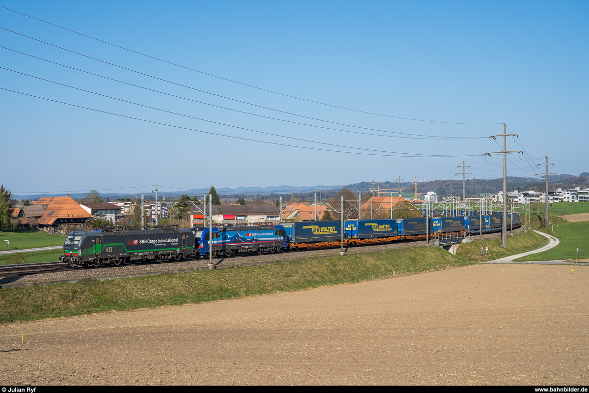 ELL / SBB Cargo International 193 256 und SüdLeasing / SBB Cargo International 193 523 am 10. April 2020 mit einem UKV-Zug bei Moosseedorf. Julian Ryf