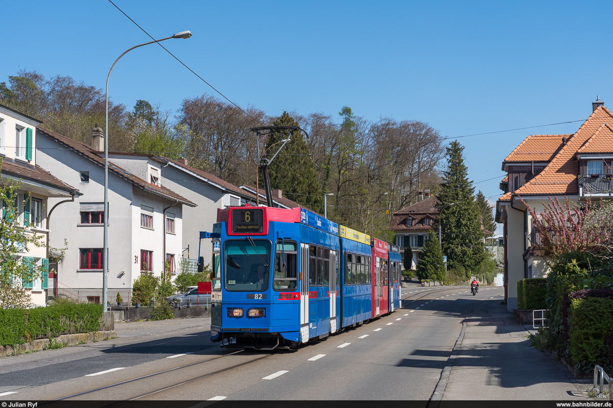 RBS Be 4/10 82 auf der Linie 6 von Worb Dorf nach Bern Fischermätteli am 25. April 2021 unterwegs auf dem noch eingleisigen Abschnitt in der Thunstrasse zwischen Muri und Egghölzli. Julian Ryf