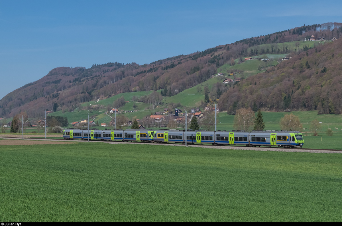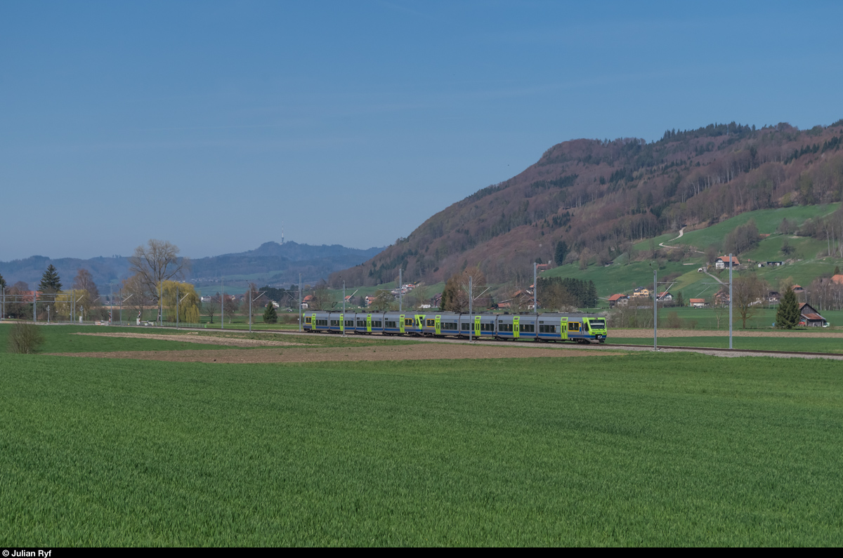 Eine Doppeltraktion NINA fährt am 10. April zwischen Toffen und Kaufdorf auf der S44 in Richtung Thun.