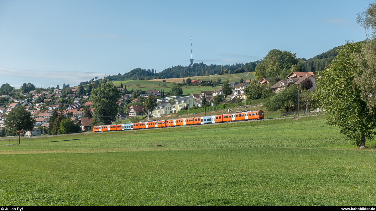 Am 25. August 2013 feierte der RBS 100 Jahre Worblentalbahn mit Feierlichkeiten entlang der ganzen Strecke von Bern nach Worb. Der normalerweise am Wochenende gefahrene Halbstundentakt wurde zu einem Viertelstundentakt verdichtet und die Züge alle mit Doppeltraktionen gefahren. Zum Einsatz kamen alle derzeit beim RBS eingesetzten Fahrzeugtypen, so auch die hauptsächlich auf den RE Bern-Solothurn eingesetzten RABe 4/12 "NExT" von Stadler Rail. Hier verlässt NExt 31 mit einem Schwesterfahrzeug gerade die Haltestelle Vechigen. Julian Ryf