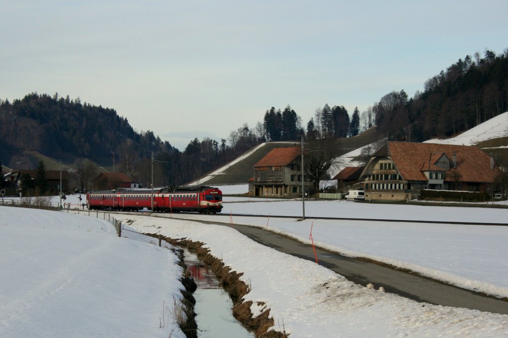 Einst war geplant, die Pendelzüge Typ NPZ I des RM durch die neuen Stadler-GTW zu ersetzen. Der starke Fahrgastzuwach auf der Berner S-Bahn in den letzten Jahren führte allerdings dazu, dass die Züge ausserhalb des S-Bahn-Netzes weiterhin täglich im Einsatz stehen. Haupteinsatzgebiet sind die Regionalzüge zwischen Hasle-Rüegsau und Thun. Auf einem solchen Einsatz entstand am 22.2.2010 auch diese Aufnahme eines dreiteiligen Pendelzuges zwischen Bigenthal und Walkringen. Jonas Schaufelberger