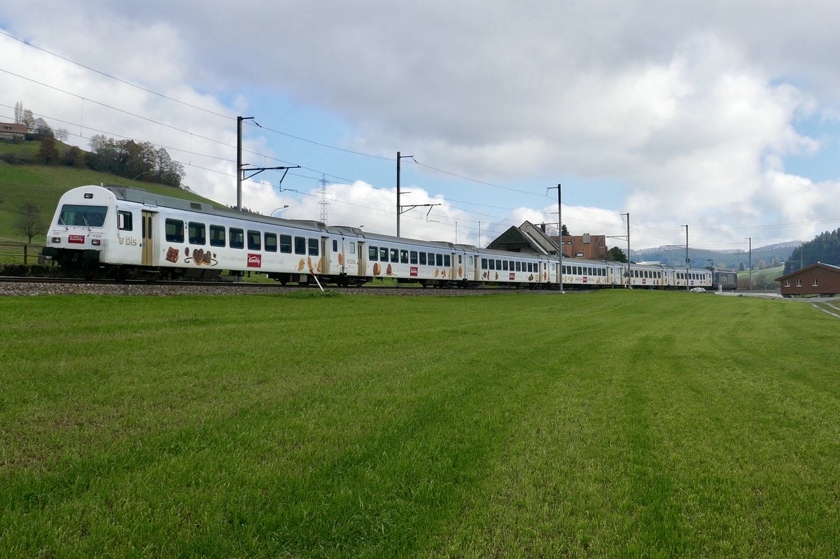 Die S2 15257 (Laupen - Langnau), geschoben vom RBDe 565 742, hat vor kurzer Zeit auf dem Doppelspurabschnitt Konolfingen - Zäziwil den RE Luzern-Bern gekreuzt und fährt nun nach kurzem Halt in Zäziwil auf den Einspurabschnitt Richtung Bowil. 22.2.2010 Jonas Schaufelberger