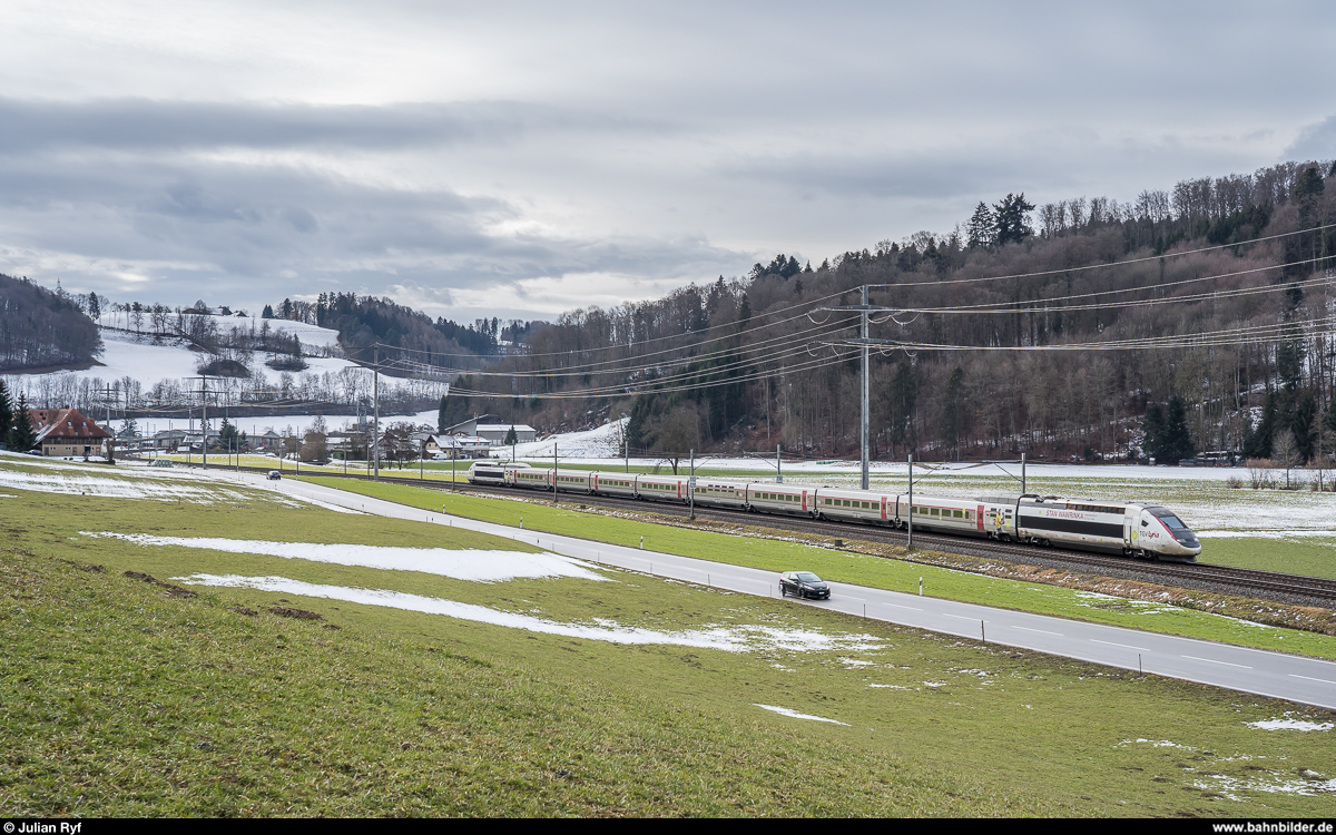 Noch immer sind die TGV-Züge nicht mit einem Schweiz-kompatiblen ETCS ausgerüstet und fahren schleichen zwischen Bern und Olten gemütlich über die Stammstrecke durchs Önztal. Am 9. Februar 2019 ist Einheit 4407 "Stan Wawrinka" bei Hermiswil unterwegs als TGV 9216 von Bern nach Paris. Julian Ryf