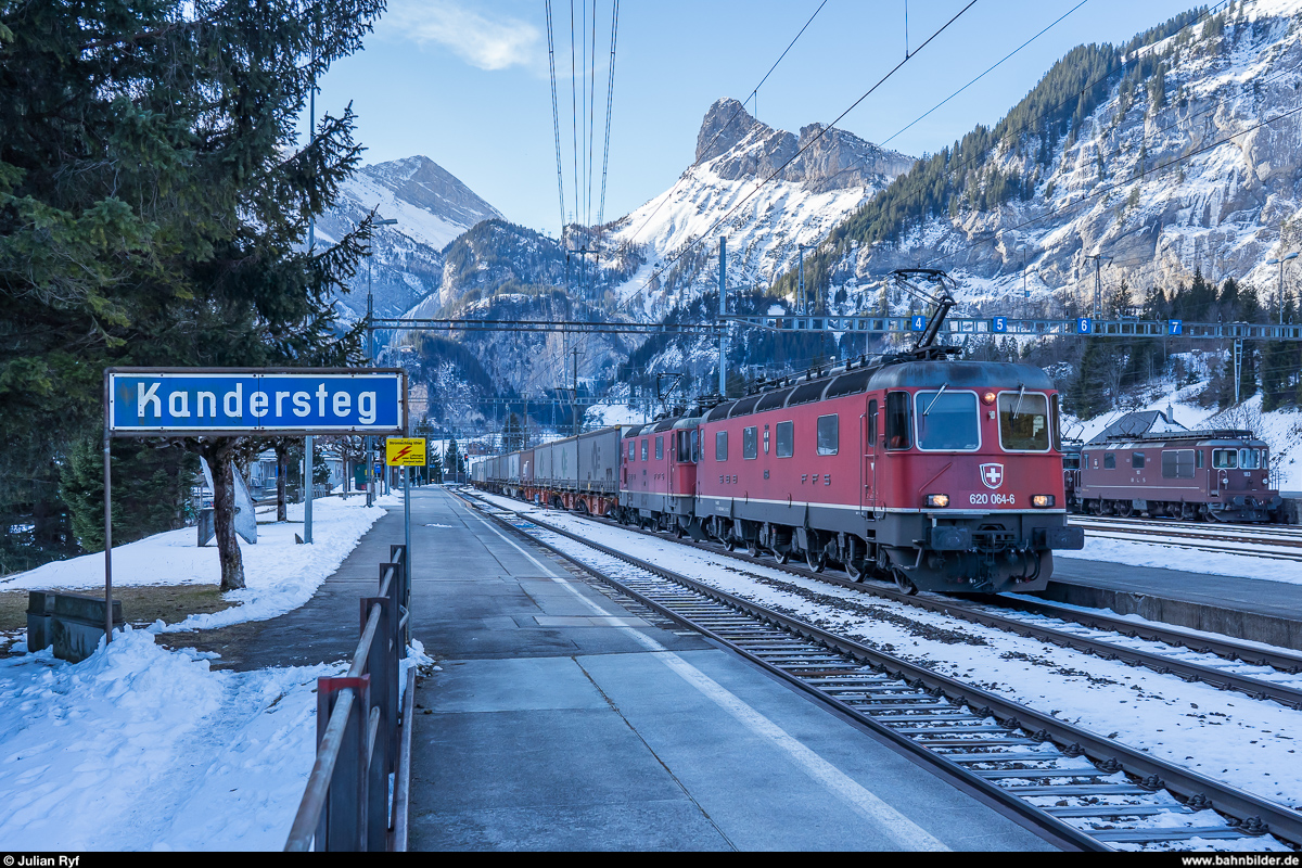 Am 9. Februar 2020 führt die Re 6/6 11664 "Köniz" zusammen mit einer Re 4/4 II einen UKV-Zug durch den Bahnhof Kandersteg nordwärts. Julian Ryf