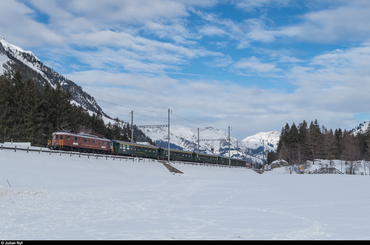 BLS Ae 6/8 205 zieht den Swiss Classic Train am 24. Januar 2016 an die Eröffnung der Belle Epoque Woche in Kandersteg. Aufgenommen kurz vor dem Bahnhof Kandersteg. Julian Ryf