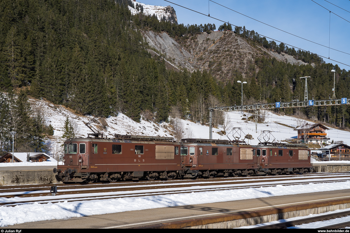 Viele Güterzüge gibt es auf der Lötschberg-Bergstrecke seit 2007 der Basistunnel eröffnet wurde nicht mehr zu sehen. Am 24. Januar 2016 hatte ich jedoch Glück und habe bei Kandersteg diesen BLS Cargo UKV-Zug von Domodossola nach Rotterdam bespannt mit zwei Loks der Baureihe 186 / Re 486 (und einer weiteren Re 486 als Schiebelok) erwischt. Julian Ryf