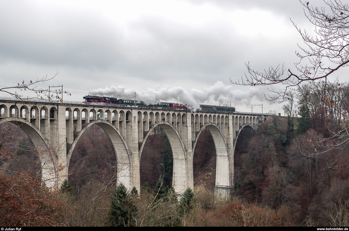 Eine mächtige Dampffahne hinter sich herziehend überfährt die 01 202 aus Lyss den Grandfey-Viadukt kurz vor Fribourg. Ihre Reise führt sie am 6. Dezember 2014 an den Weihnachtsmarkt nach Montreux. Julian Ryf