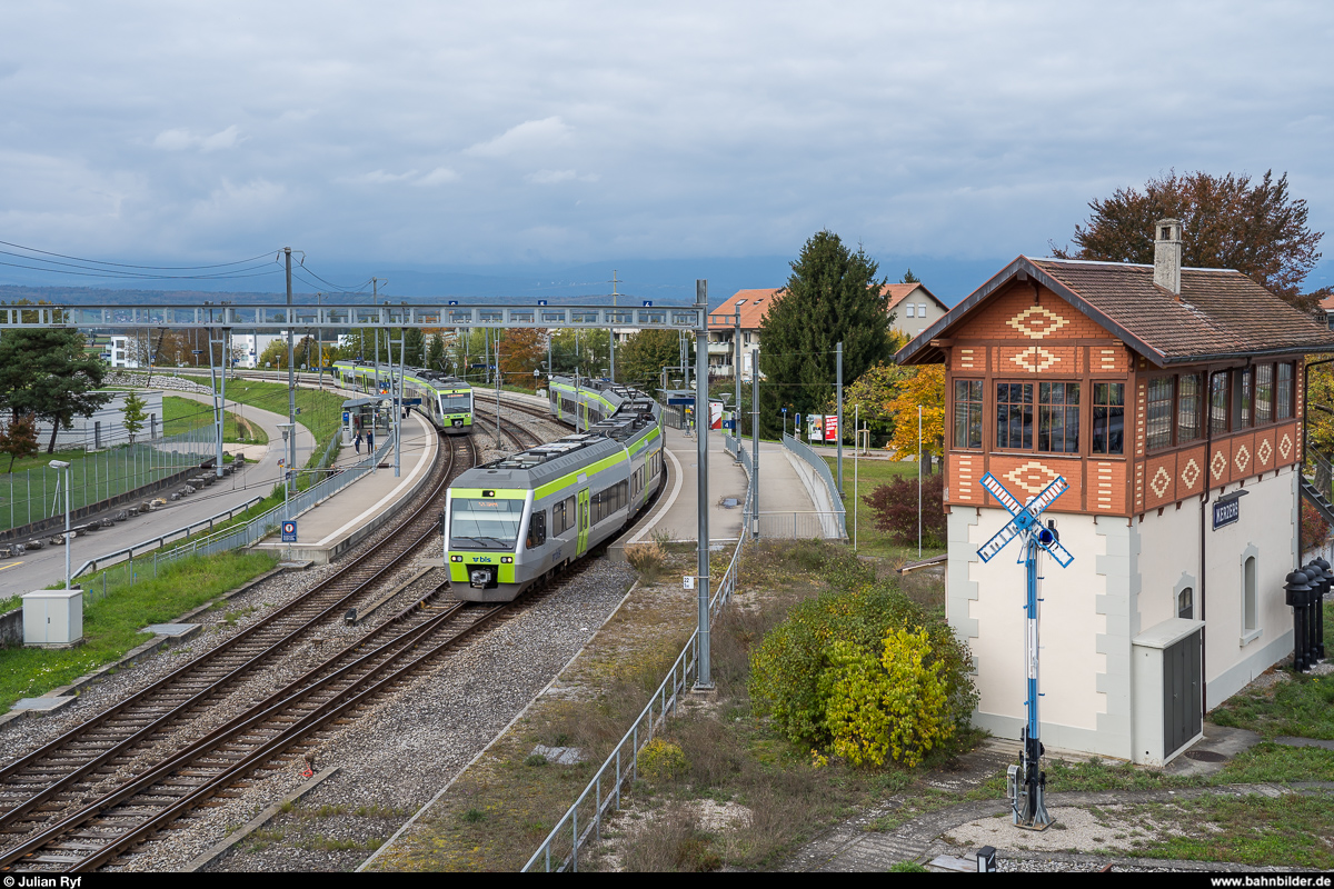 S5 Flügelung und Kreuzung im Bahnhof Kerzers am 17. Oktober 2020. Der Zug auf Gleis 4 fährt gerade aus in Richtung Bern, auf Gleis 6 wurden die beiden NINA-Triebzüge gerade getrennt um danach nach Neuchâtel bzw. Murten weiterzufahren. Aufgenommen von der erst seit kurzem wieder zugänglichen restaurierten historischen Fussgängerüberführung. Julian Ryf