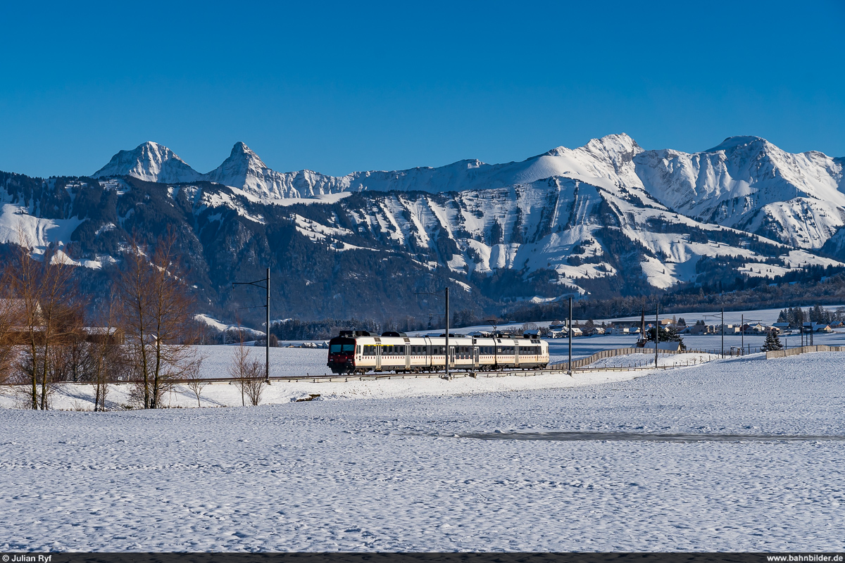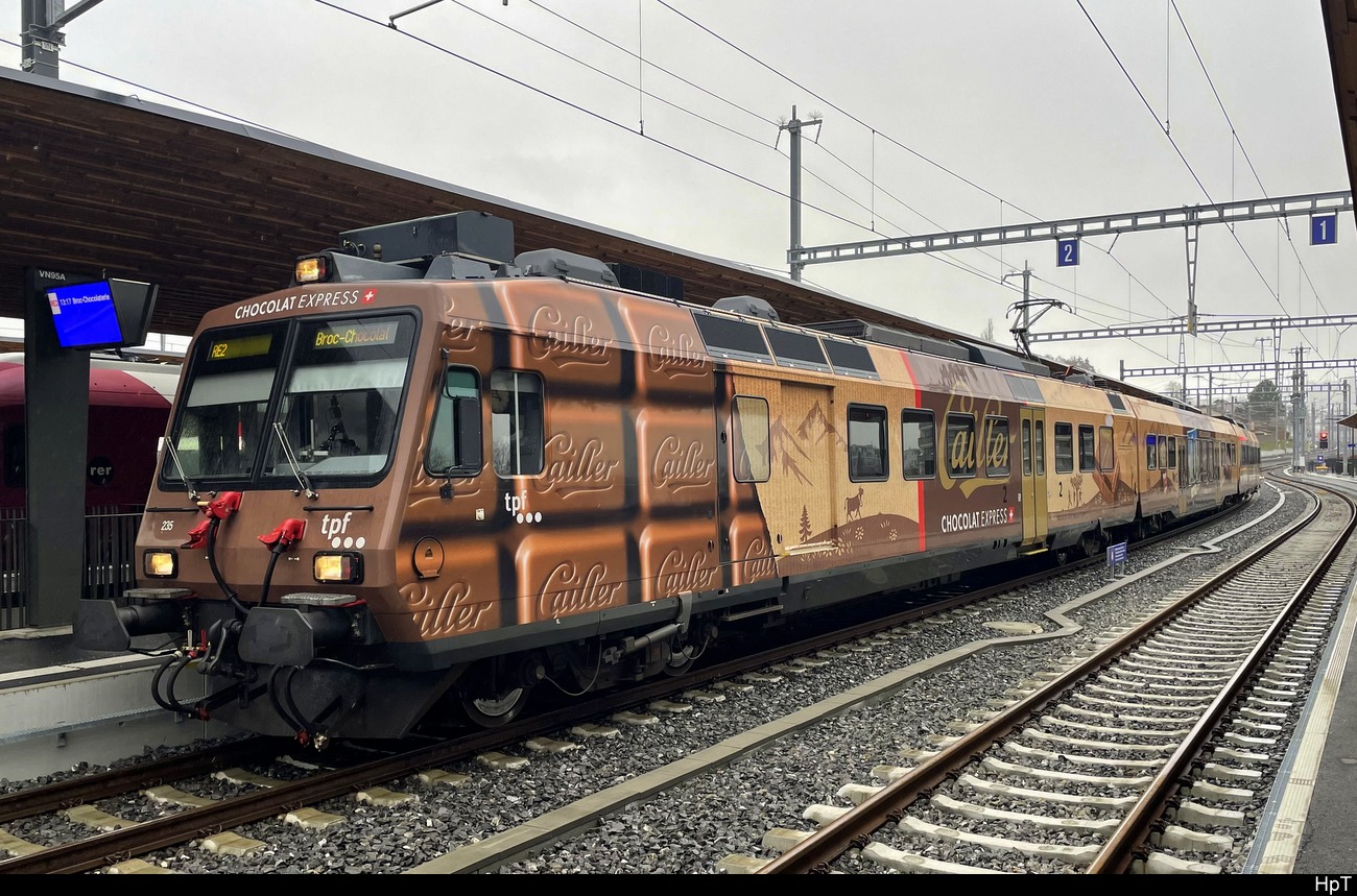 Der TPF Be 2/4 - B - ABt 2/4 103 verlässt den Bahnhof von Châtel St-Denis, bzw. das was noch davon übrig geblieben ist; zwei Monate später werden die Züge wieder bis Palézieux verkehren und den neuen Durchgangsbahnhof nutzen.