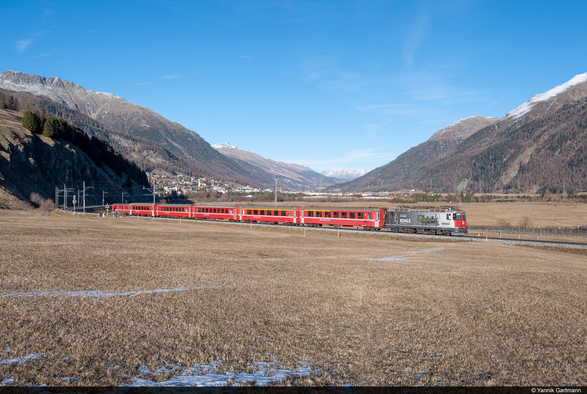 RhB Vorortspendel mit Be 4/4 514 als Ersatzzug für einen RE St. Moritz - Landquart auf dem Abschnitt St. Moritz - Samedan am 16. Januar 2021 in Samedan. Julian Ryf