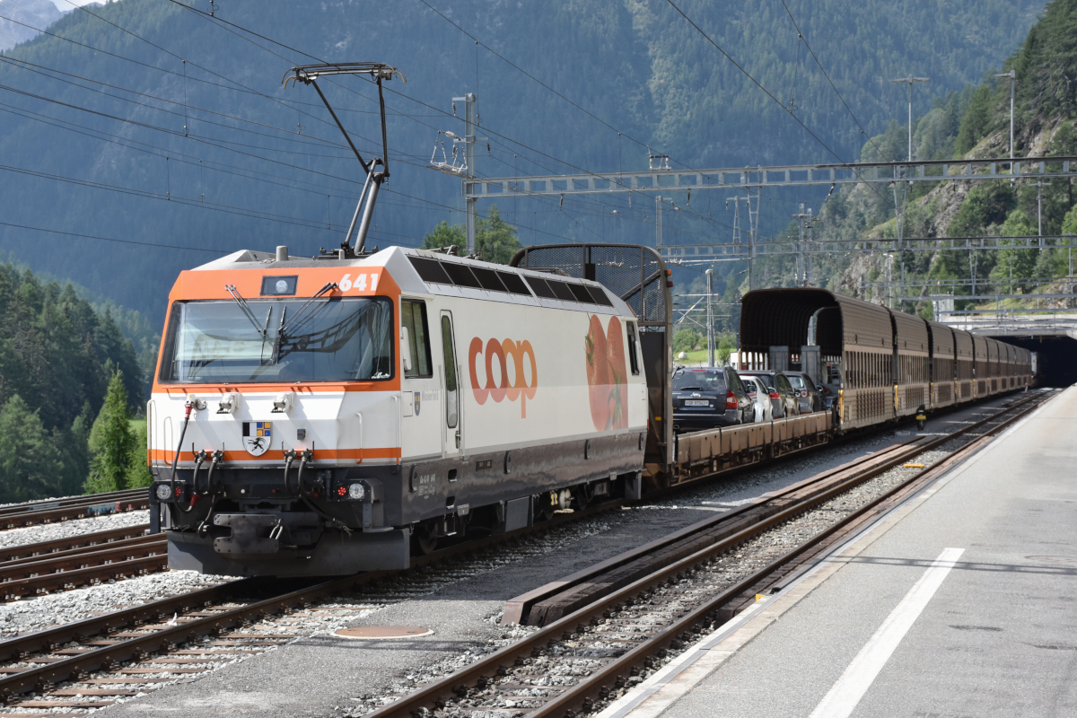 Lok Ge 4/4 III Nr. 641 »Maienfeld« (mit Coop-Werbung) schiebt ihren Auto-Zug am 13.08.2021 in der Station Sagliains CAutoverlad Süd) in Richtung Vereina-Tunnel (Verbindung vom Engadin in den Prättigau). Georg Friebe