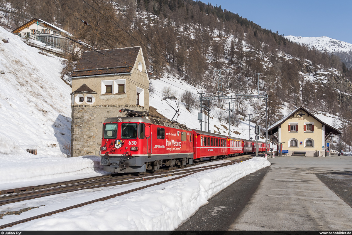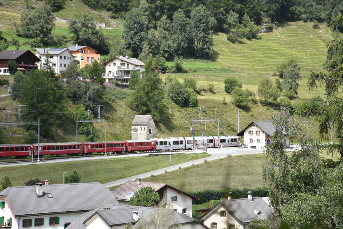 RhB ABe 8/12 Nr. 3512 »Jörg Jenatsch« (mit ABB-Werbung) erreicht am 13.08.2021 mit einigen Personenwaggons im Schlepptau die Haltestelle Susch. Georg Friebe