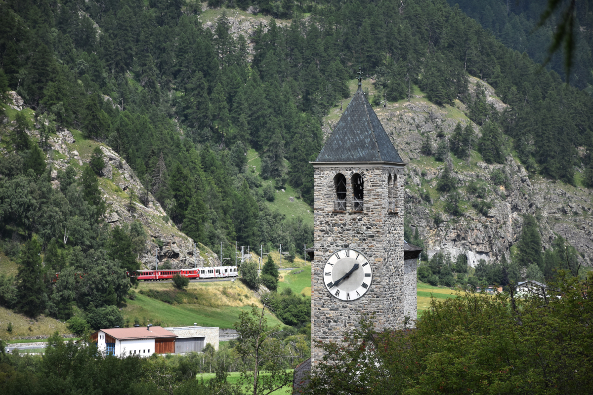 RhB ABe 8/12 Nr. 3512 »Jörg Jenatsch« (mit ABB-Werbung) hat am 13.08.2021 mit einigen Personenwaggons im Schlepptau die Haltestelle Susch in Richtung Scuol-Tarasp verlassen. Im Vordergrund der Kirchturm von Susch. Georg Friebe