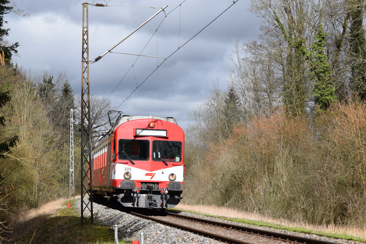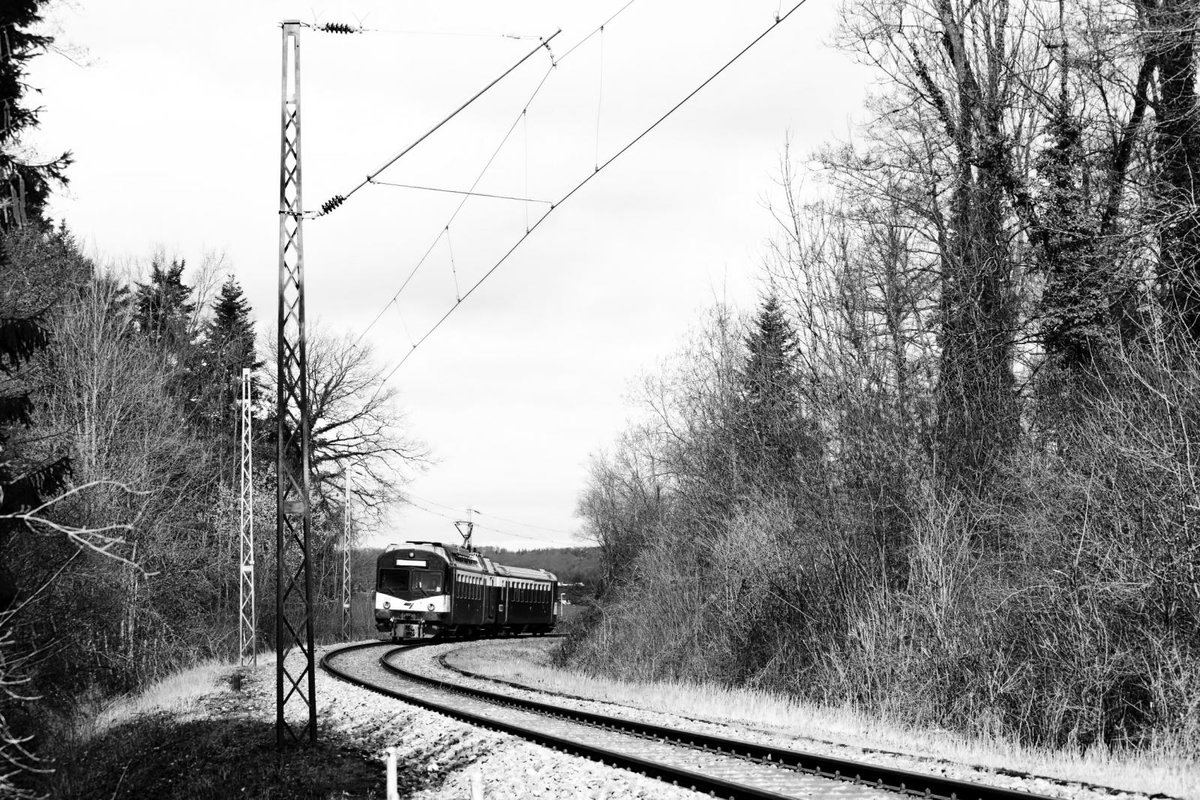 RBDe 566 222-6 ex-BLS à la sortie du village de Bonfol, On peux encore apercevoir sur cette ligne des anciens mât porte caténaire. Photographier aujourd'hui avec un filtre noir et blanc pour avoir un petit goût du passé..