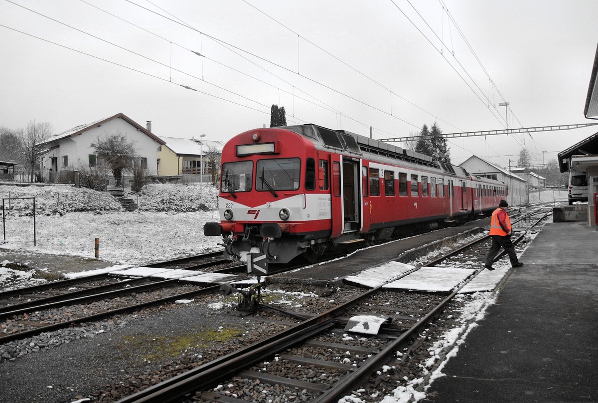 Triebwagen 222 + Steuerwagen ABt 922 mit Wagenführer im winterlichen Bonfol. Unter dem Signet CJ sind noch die Buchstaben "BLS" von seinem letzten Einsatzort Thun - Hasle Rüegsau deutlich sichtbar. 11.Januar 2019 Peter Ackermann