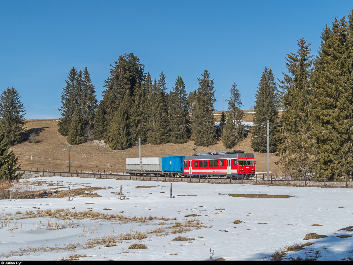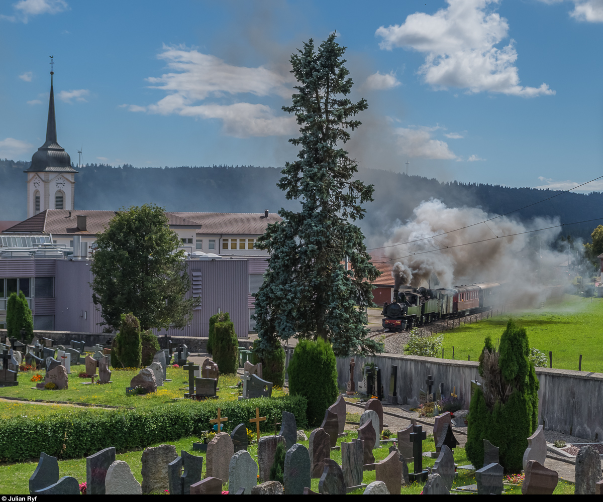 La Traction Dampf-Doppeltraktion am 21. August 2016: Die G 2x2/2 E 164 und die G 2/3+3/3 E 206 fahren bei La Chaux-des-Breuleux talwärts. Durch den Pfiff der beiden Loks haben sich die Kühe und Pferde leider aus dem Staub bzw. aus dem Bild gemacht. Julian Ryf