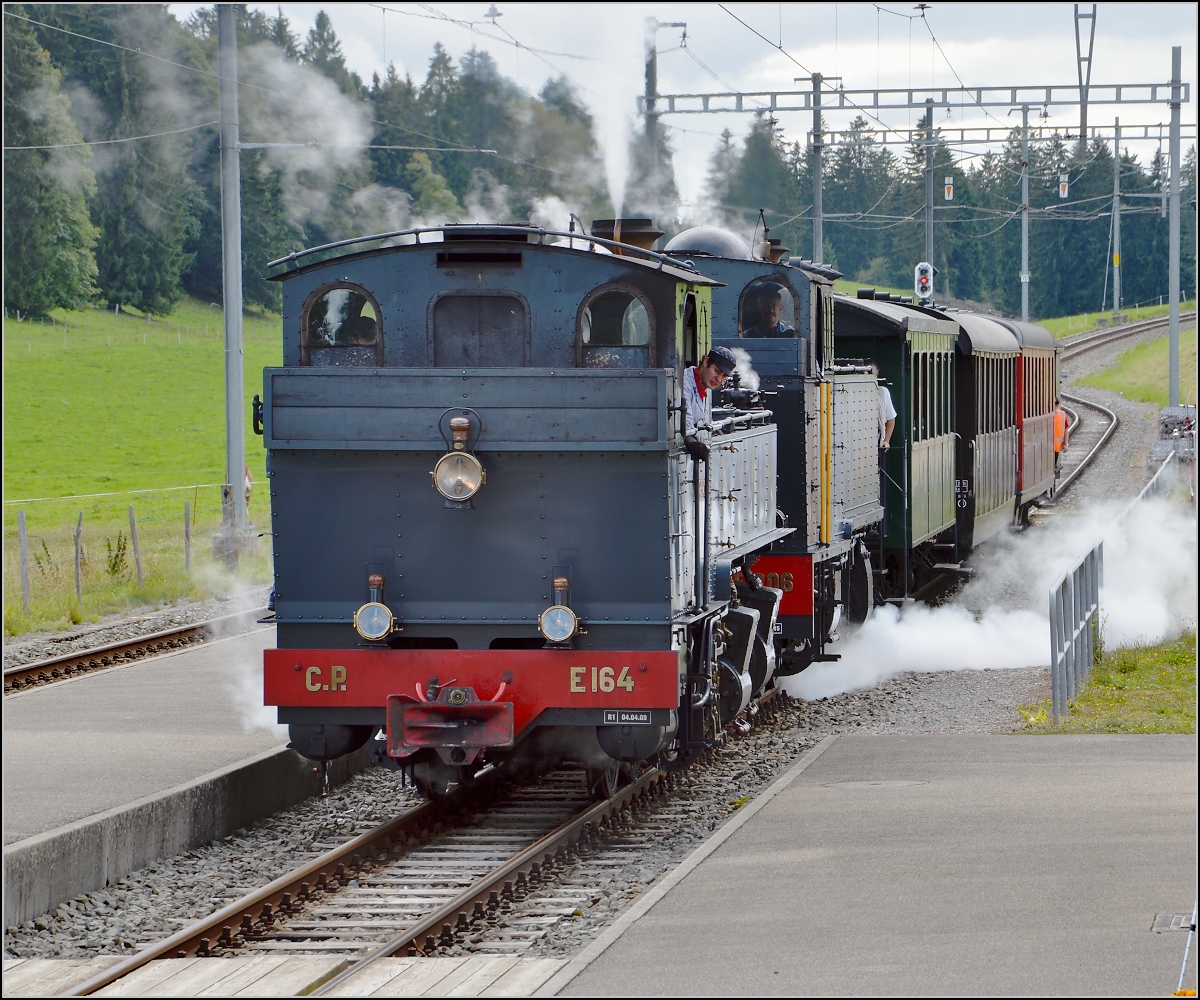 Doppeltraktionsfahrt von La Traction mit den portugiesischen Dampfloks G 2/3 + 3/3 E 206 und G 2x2/2 E 164 im August 2016. Abfahrt in Pré-Petitjean. Olli