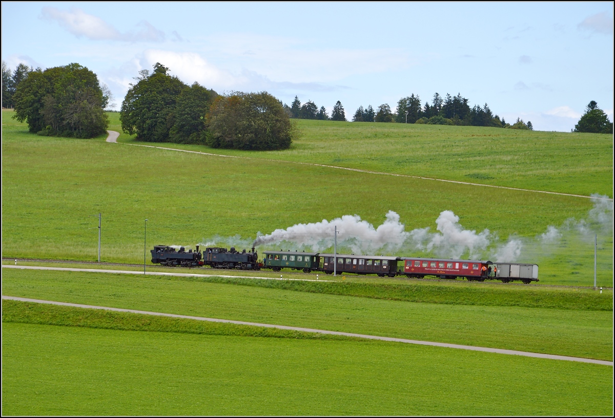 Doppeltraktionsfahrt von La Traction mit den portugiesischen Dampfloks G 2/3 + 3/3 E 206 und G 2x2/2 E 164 im August 2016 bei Muriaux.