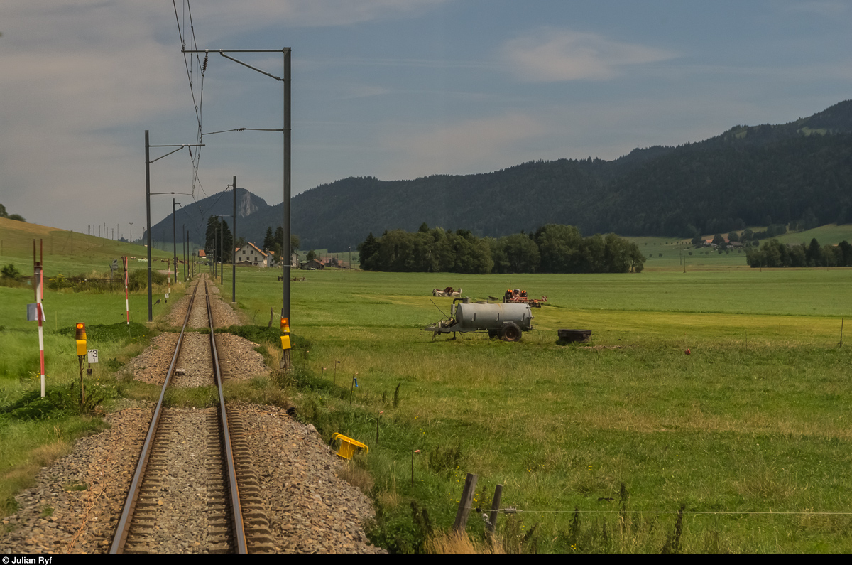 Das Bild vom 4. August 2016 soll zwei Sachen zeigen. Erstens: Die "Bahnübergänge" (wenn man die Kuhwege so nennen kann) auf der Strecke sind wirklich zahlreich vorhanden, eine Lösung wie bei der Strecke Le Locle - Les Brenets, wo die Übergänge im Schritttempo überfahren werden, schied daher von vornherein aus. Und zweitens: Die "Sanierung" bestand vorerst aus einem Paar Baustellenlampen, die an einzelnen Übergängen montiert wurden (wieso ausgerechnet an diesem Übergang und am nächsten nicht, ist mir leider nicht ganz klar). Julian Ryf