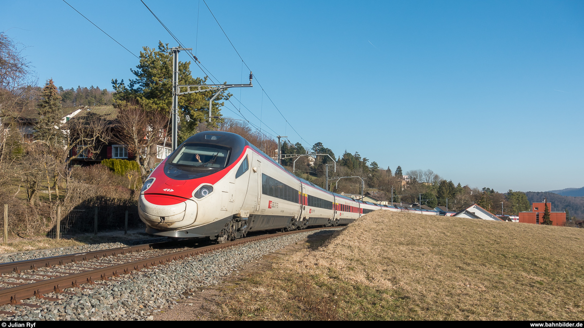 Doppeltraktion RABe 503 am 18. Februar 2019 als umgeleiteter EC 52 in Trimbach an der alten Hauensteinlinie. Grund für die Umleitung war ein Gleisschaden mit folgendem Einspurbetrieb im Hauensteinbasistunnel kombiniert mit einer Verspätung des EC von 45 Minuten. Julian Ryf