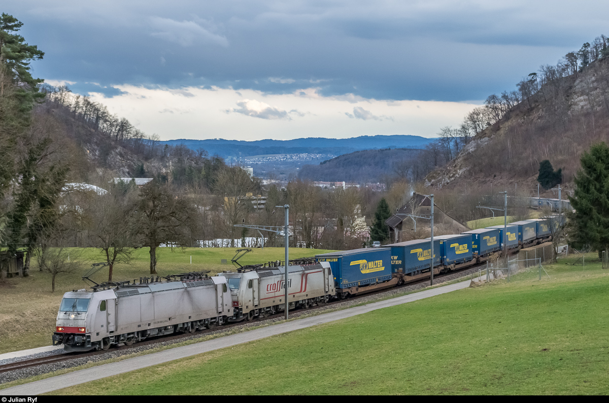 Eine RoLa mit 187 004 und 485 019 am 4. März 2017 kurz vor dem alten Hauensteintunnel bei Trimbach.
