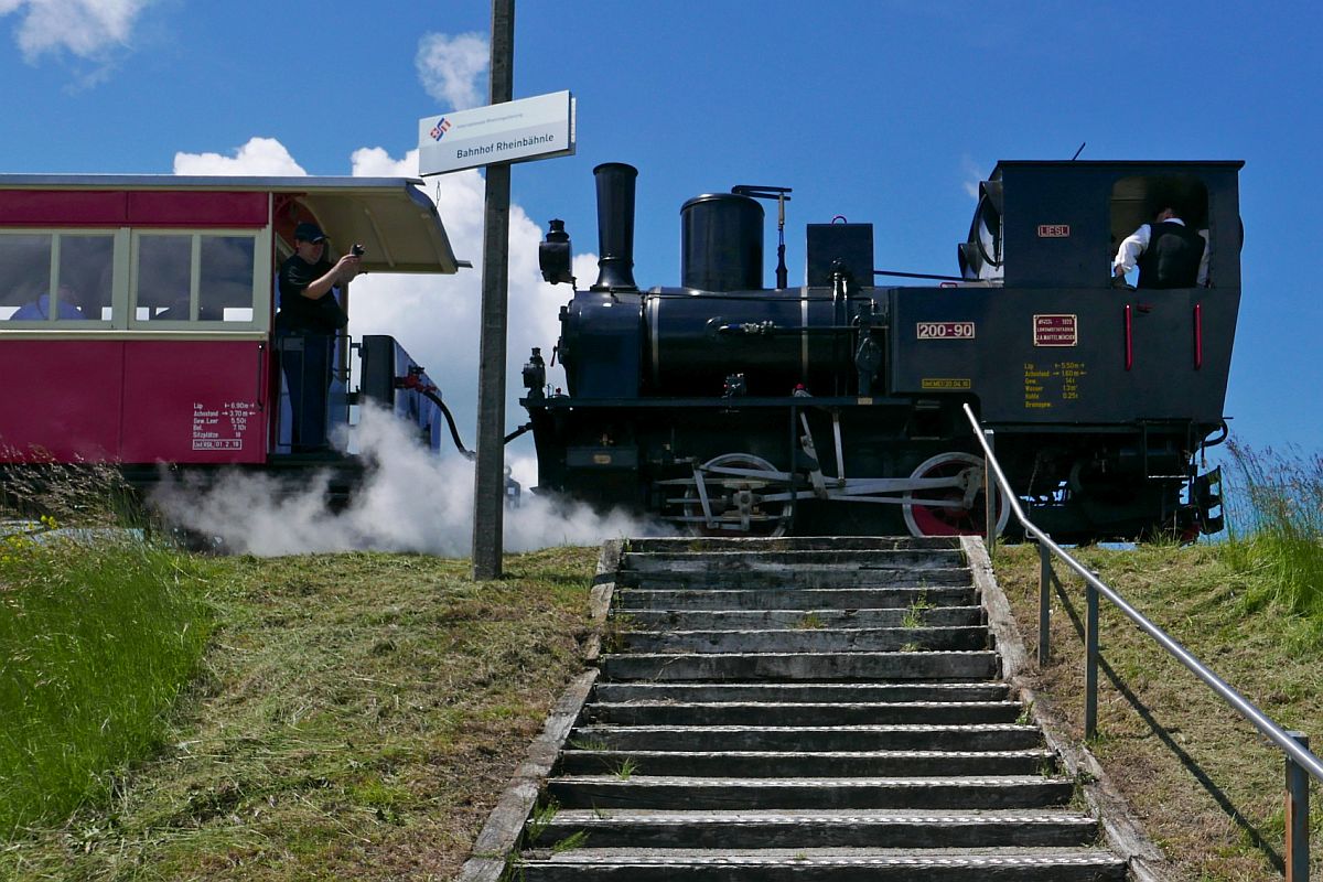 'Da ist ja Urs!' Auf der Fahrt von Wiesenrain bis zum Streckenunterbruch in Kriessern überholt Lok "URS" mit den Personenwagen und den Fahrgästen der vom Verein Rhein-Schauen organisierten 'Fotofahrt für Liebhaber' Dampflok "LIESL" im Bahnhof Rheinbähnle (30.05.2019). Jürgen Vos