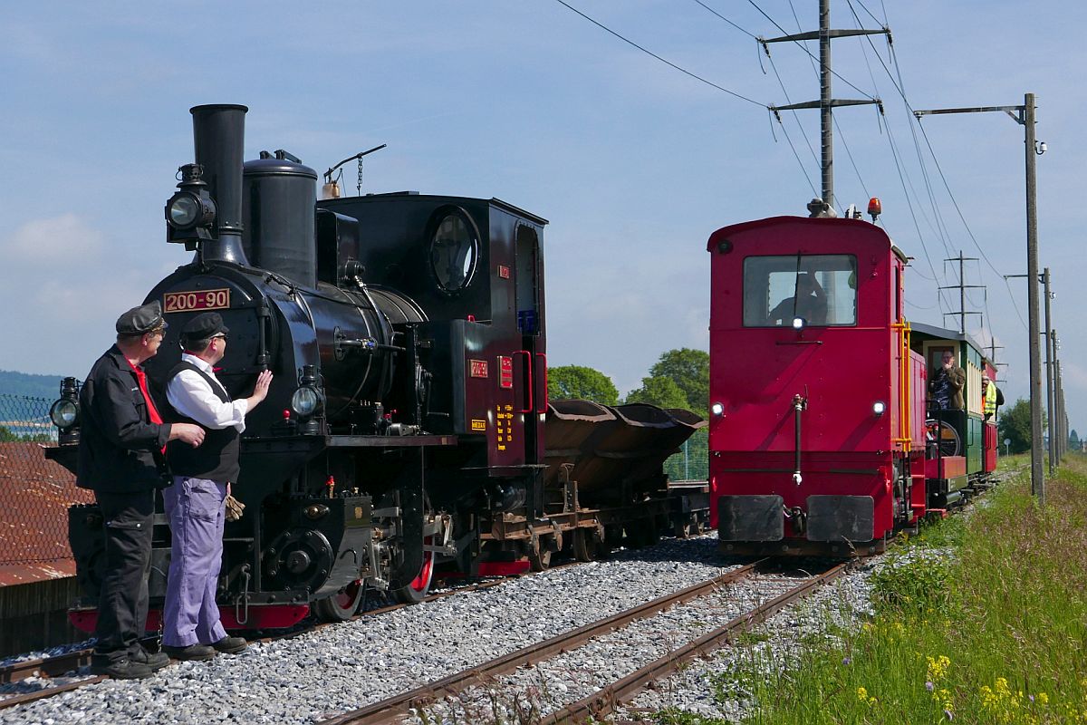 'Wo bleibt denn Urs mit den Personenwagen?' So könnte die Haltung von Lokführer und Heizer gedeutet werden. Dampflok 200-90 "LIESL", gebaut 1920 von J.A. MAFFEI unter der Nr. 4124, wartet im Bahnhof Rheinbähnle auf den Personenzug, gezogen von der elektrischen/dieselektrischen Lok "URS", damit dieser auf der Fahrt nach Kriessern an der einzig möglichen Stelle am Güterzug vorbeifahren kann (30.05.2019). Jürgen Vos