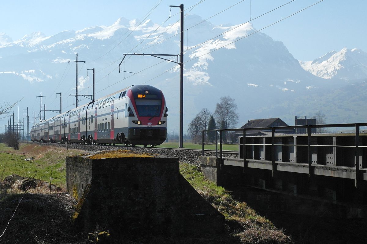 In Buchs SG lenkt die Gebirgskulisse des Alpsteins beinahe vom einfahrenden RABe 511 034 (als RE nach Chur) ab: Rechts ist der Hohe Kasten etwas verdeckt, links die Stauberenkanzel (04.03.2018). Georg Friebe